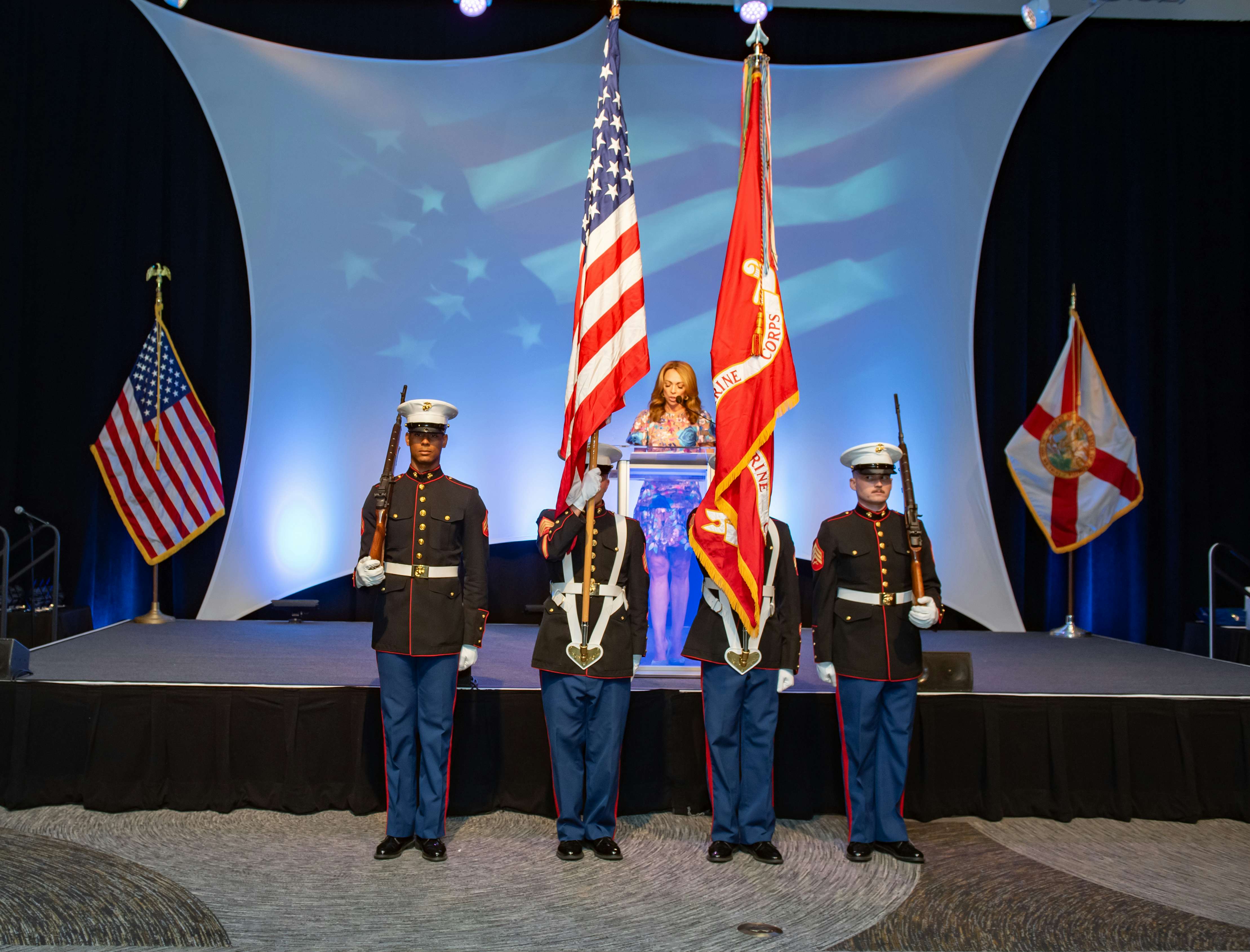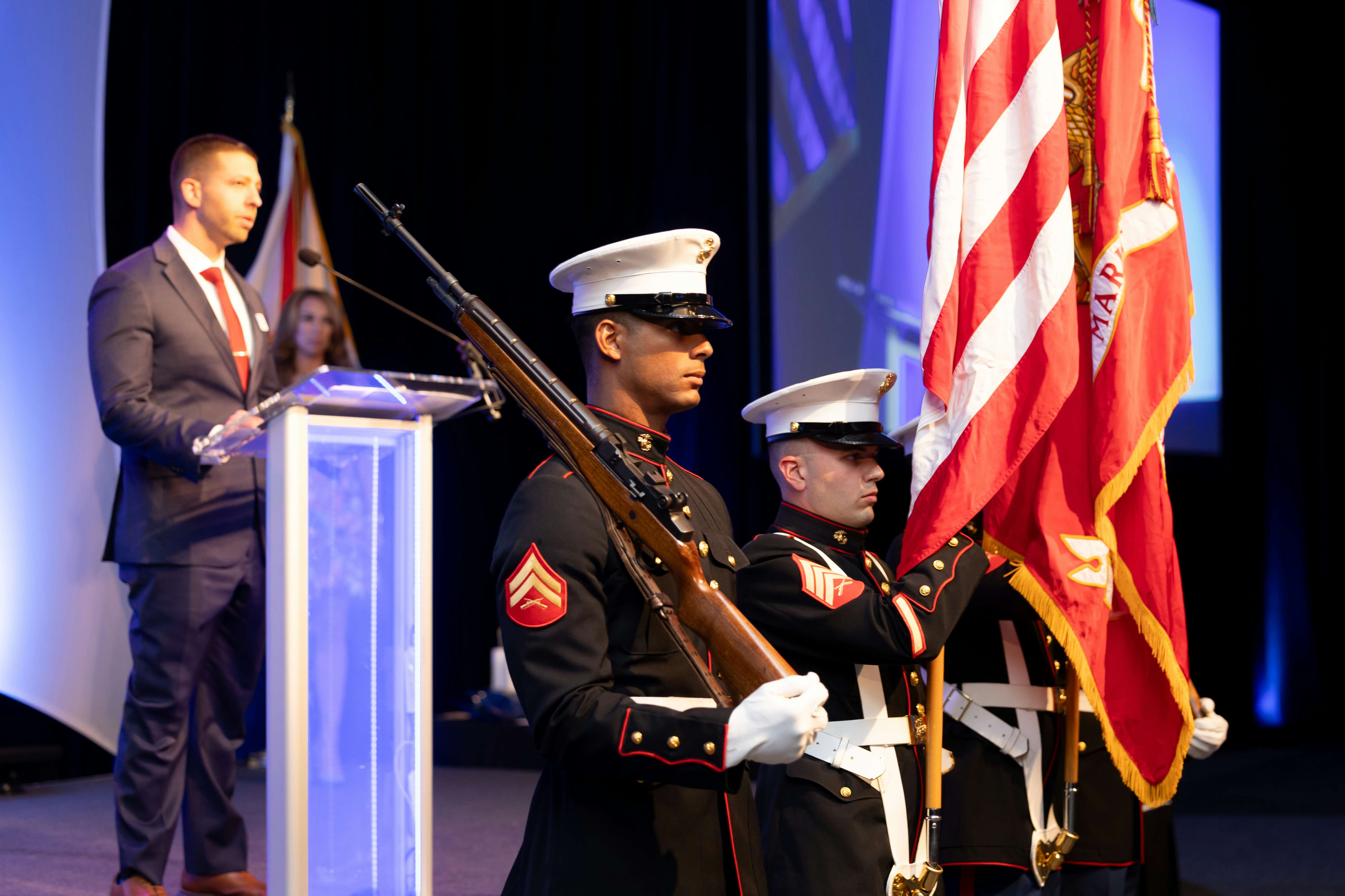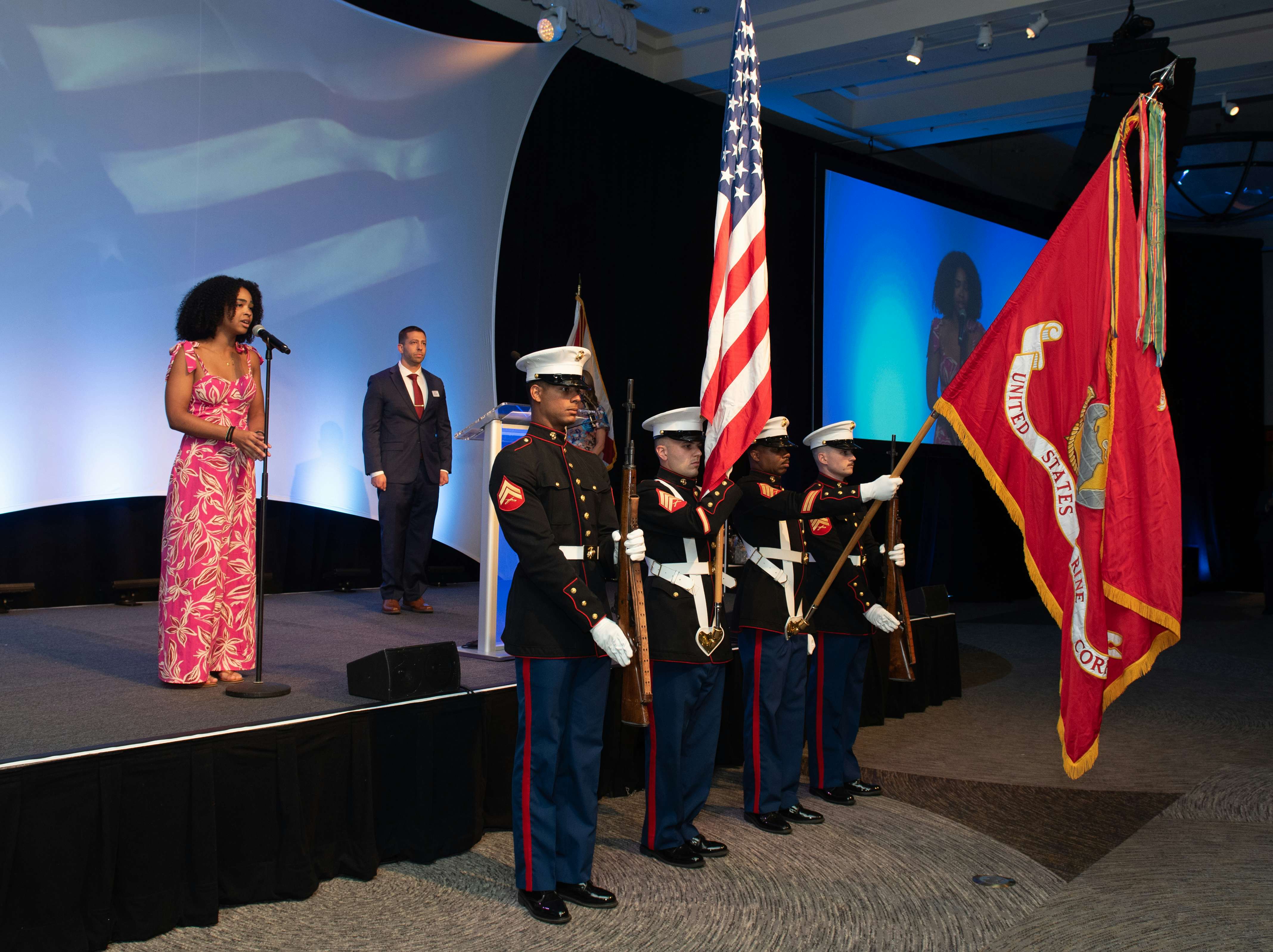 The evening began with a stirring presentation of the colors presented by the 4th Air Naval Gunfire Liaison Company of the U.S. Marine Corps, under the command of Lieutenant Colonel William F. Dammin. Henry Moreno, Chair of MISSION UNITED and UWPBC Board Member, led the audience in the Pledge of Allegiance.